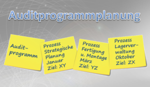 Häufig wird das Auditprogramm lediglich als eine Vorgabe zur Planung der Audittermine für einen festgelegten Zeitraum, z.B. als 1-Jahresplan der durchzuführenden Audits verstanden. Ein Auditprogramm umfasst jedoch viel umfangreichere Aktivitäten zur Planung, Umsetzung, Steuerung und Optimierung des Auditprozesses. Die ISO 9001:2015 verlangt von zertifizierten Unternehmen, dass die Planung und Realisierung des Auditprogramms unter anderem die Festlegung der folgenden Aspekte umfasst: